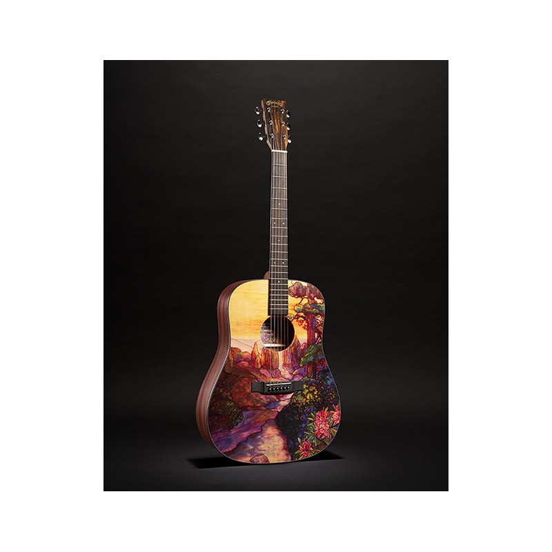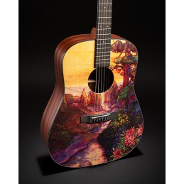 Ce modèle unique repose sur la base Dreadnought D-14 frettes, offrant une projection puissante et une belle richesse harmonique. Sa table en épicéa vernis brillant est ornée d'un motif imprimé en haute définition grâce au procédé Mimaki, représentant un paysage lumineux inspiré de vitraux historiques. Ce visuel transforme la guitare en œuvre d'art, tout en conservant les qualités acoustiques attendues d'une Martin.